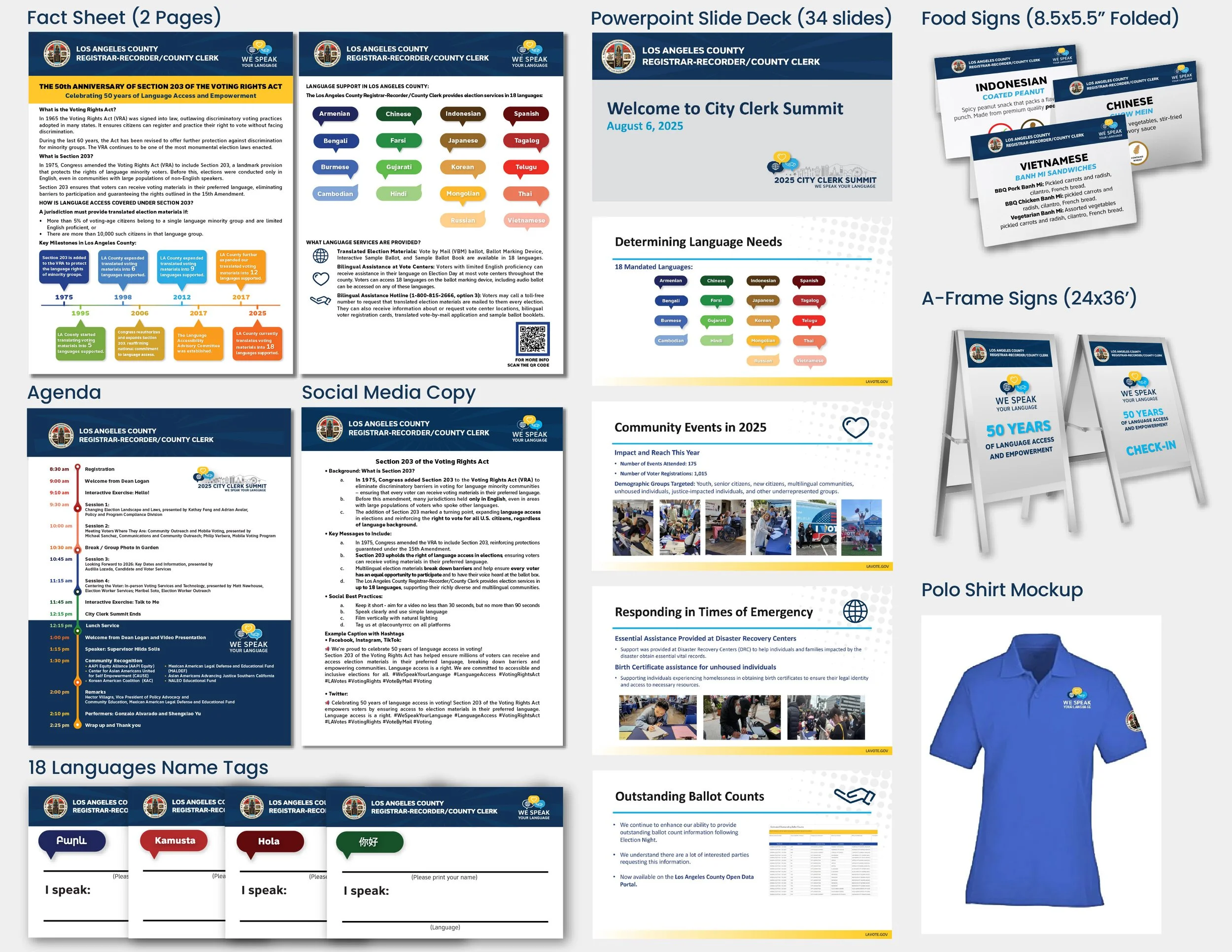 Completed in just three weeks, this recognition event celebrated the 50th Anniversary of Section 203 of the Voting Rights Act, highlighting Los Angeles County’s Language Access services for voters. I organized all 18 languages alphabetically and created a color-coded system that anchored the event’s visual identity. I led the overall branding, collaborated with the Translation Team to ensure multilingual accuracy, and captured the event photography. Deliverables included a fact sheet, social media copy deck, agenda, signage, slide deck, name tags, and on-site materials. I also designed a full lobby display mockup to raise awareness in the department’s South Lobby.