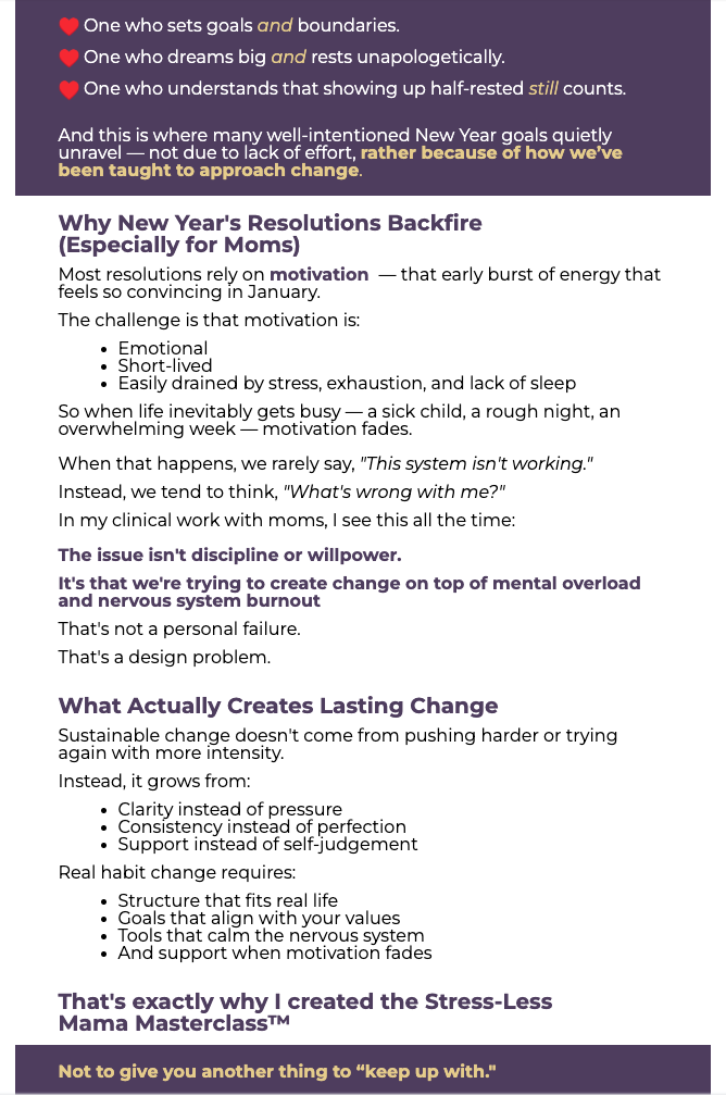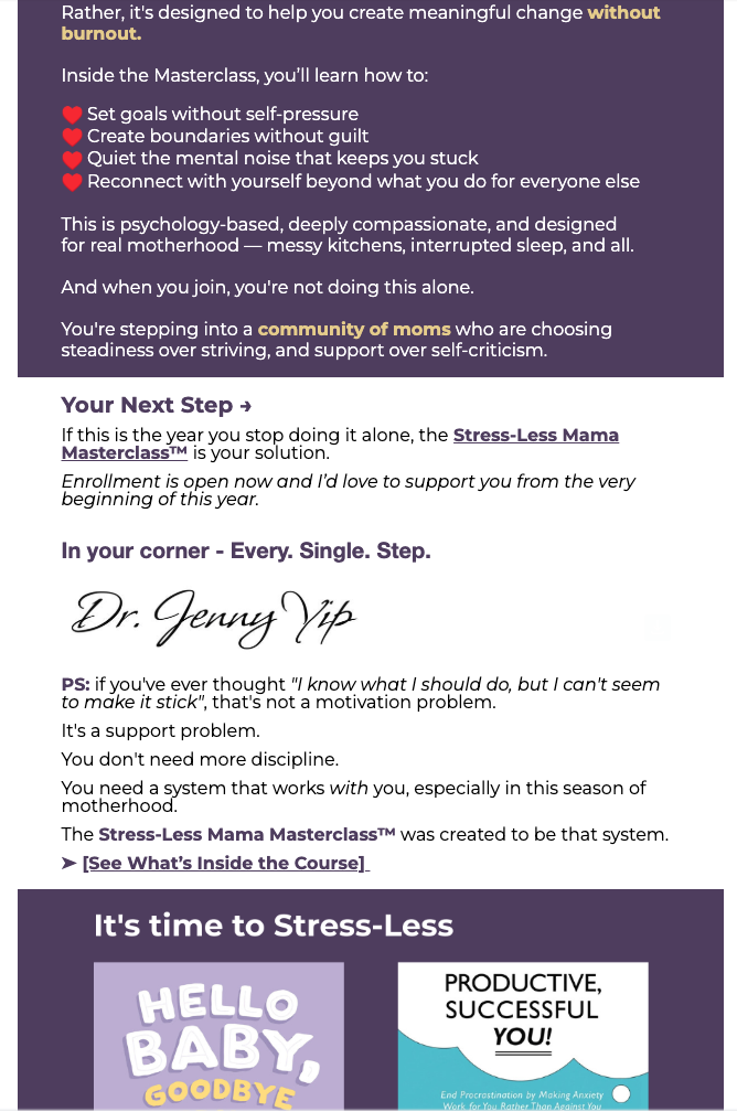The Stress-Less Mama Masterclass by Dr. Jenny Yip is a supportive, evidence-based program designed to help mothers manage anxiety, reduce overwhelm, and prevent burnout with practical tools rooted in clinical psychology. It focuses on helping moms set healthy boundaries, release guilt, and reconnect with their identities beyond motherhood through accessible lessons, workbooks, and community support. The brand reflects Dr. Yip’s compassionate, science-informed approach to maternal mental health as part of her broader Stress-Less Life™ framework. Logo was designed to show a mama carrying twin babies since Dr. Yip has twins.