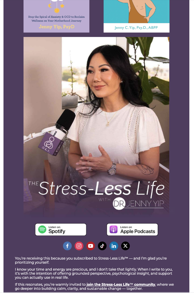 Since 2022, I have created social media graphics, engaging reels, and printed materials including workbooks and toolkits for Dr. Yip’s personal brand and educational offerings. My work has supported key initiatives such as her book launch, Hello Baby, Goodbye Intrusive Thoughts, The Stress-Less Life™ Podcast, and the Stress-Less Mama™ Masterclass. Each piece of content is thoughtfully designed to visually communicate Dr. Yip’s expertise, foster meaningful audience connection, and support the continued growth and impact of her brand. Below, you’ll find Dr. Yip’s three brands presented in individual sections: her personal brand, The Stress-Less Life™, and The Stress-Less Mama™.